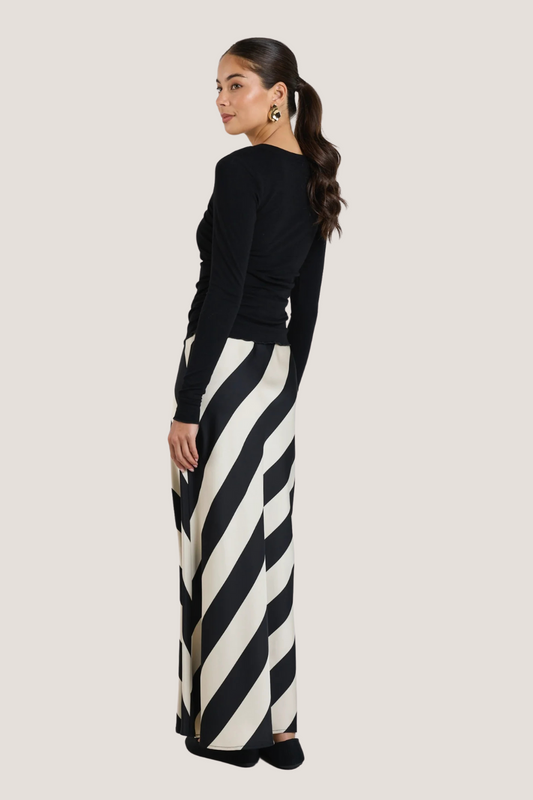 Fiery Black White Stripe Satin Bias Maxi Skirt