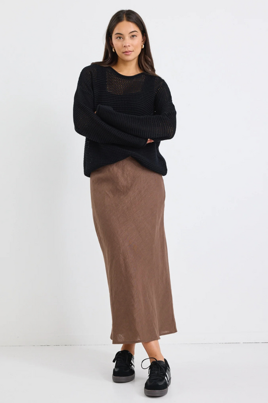 Bliss Dark Chocolate Linen Bias Midi Skirt