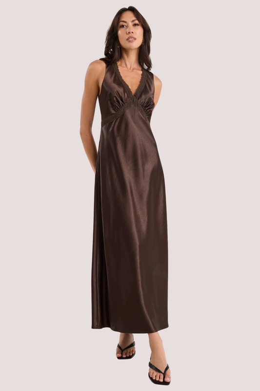 Castle Chocolate Satin Lace Trim Maxi Dress