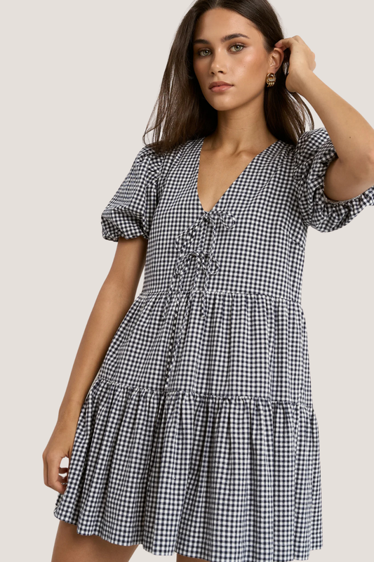 Roam Navy Gingham Puff Sleeve Tie Front Mini Dress