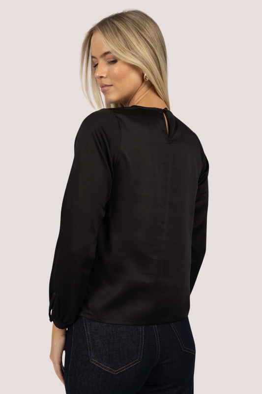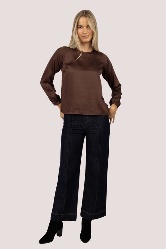 Continuance Chocolate Semi Sheer High Neck Buttoned Short Sleeve Top