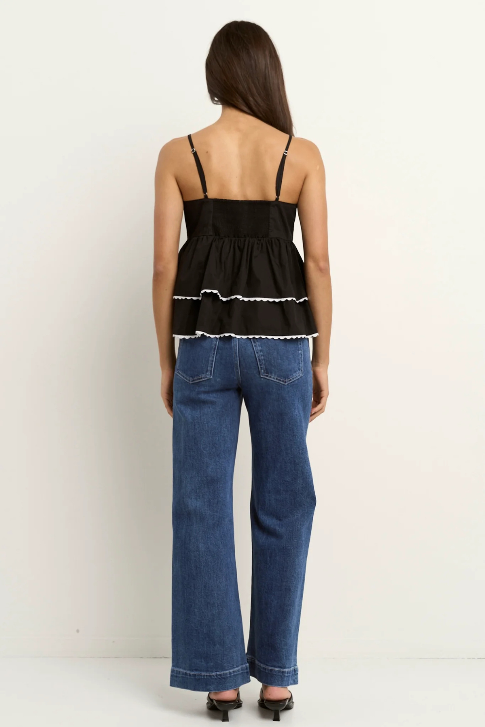 Bold and playful, the Admire black and white trim top brings a modern twist to feminine dressing. Crafted from breathable cotton, this tiered design features delicate white wave trims that pop against the crisp black fabric. The relaxed fit and slim straps offer a flattering shape that feels light and easy for every day.