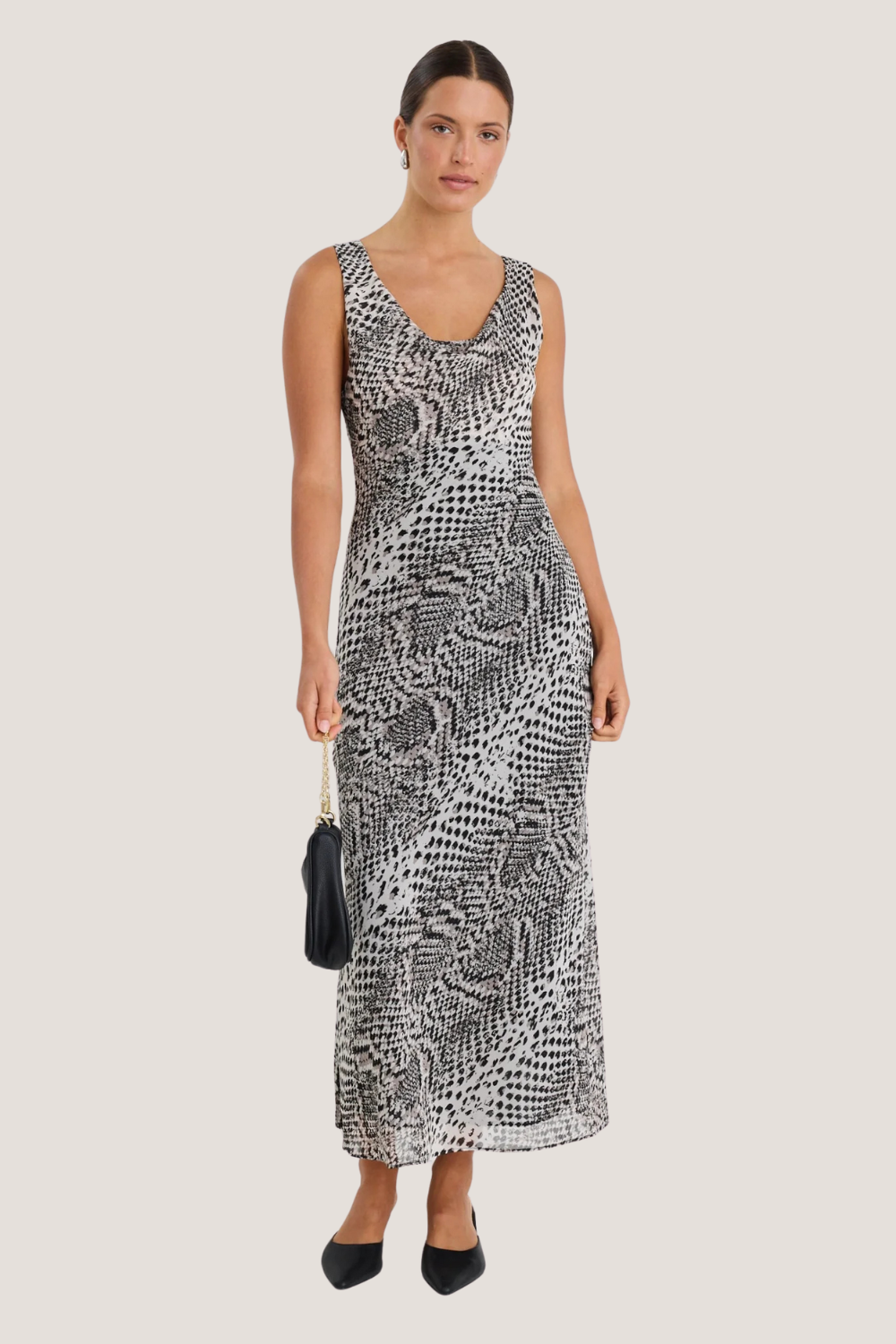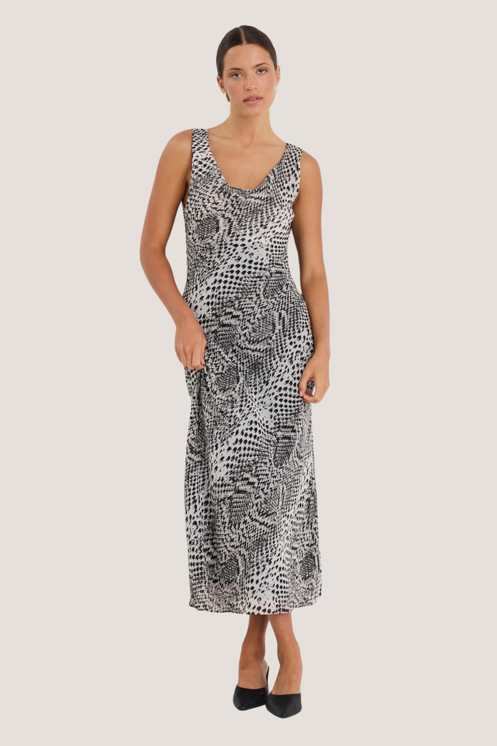 Slink into effortless elegance with the Allure charcoal snake dress. Designed with a bias cut that glides over your silhouette, this piece brings a sultry confidence to every step. The moody snake print adds a fierce edge, while the silky drape and soft lining feel like luxury against your skin.