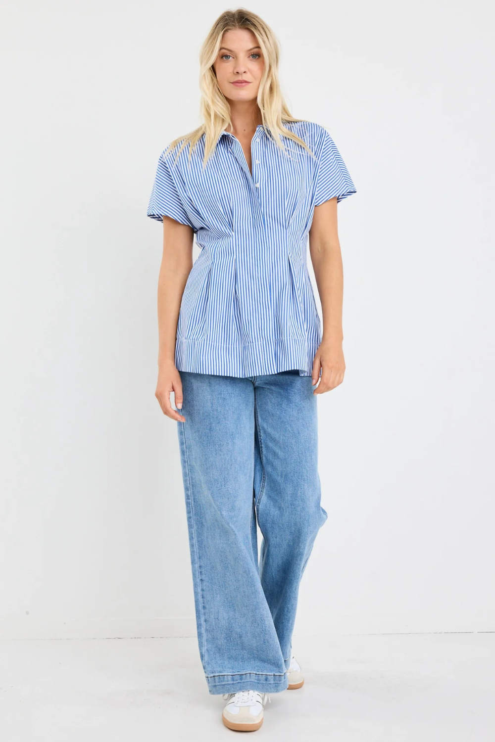 Smart, structured and effortlessly stylish the Astute blue stripe top makes a refined statement. Featuring sharp vertical stripes, softly sculpted pleats and a button-up front with a classic collar, this top blends tailored elegance with everyday ease. The short sleeves and natural fibre fabric make it breathable and ideal for trans-seasonal layering. Pair with denim or tailored trousers for timeless high-low dressing.