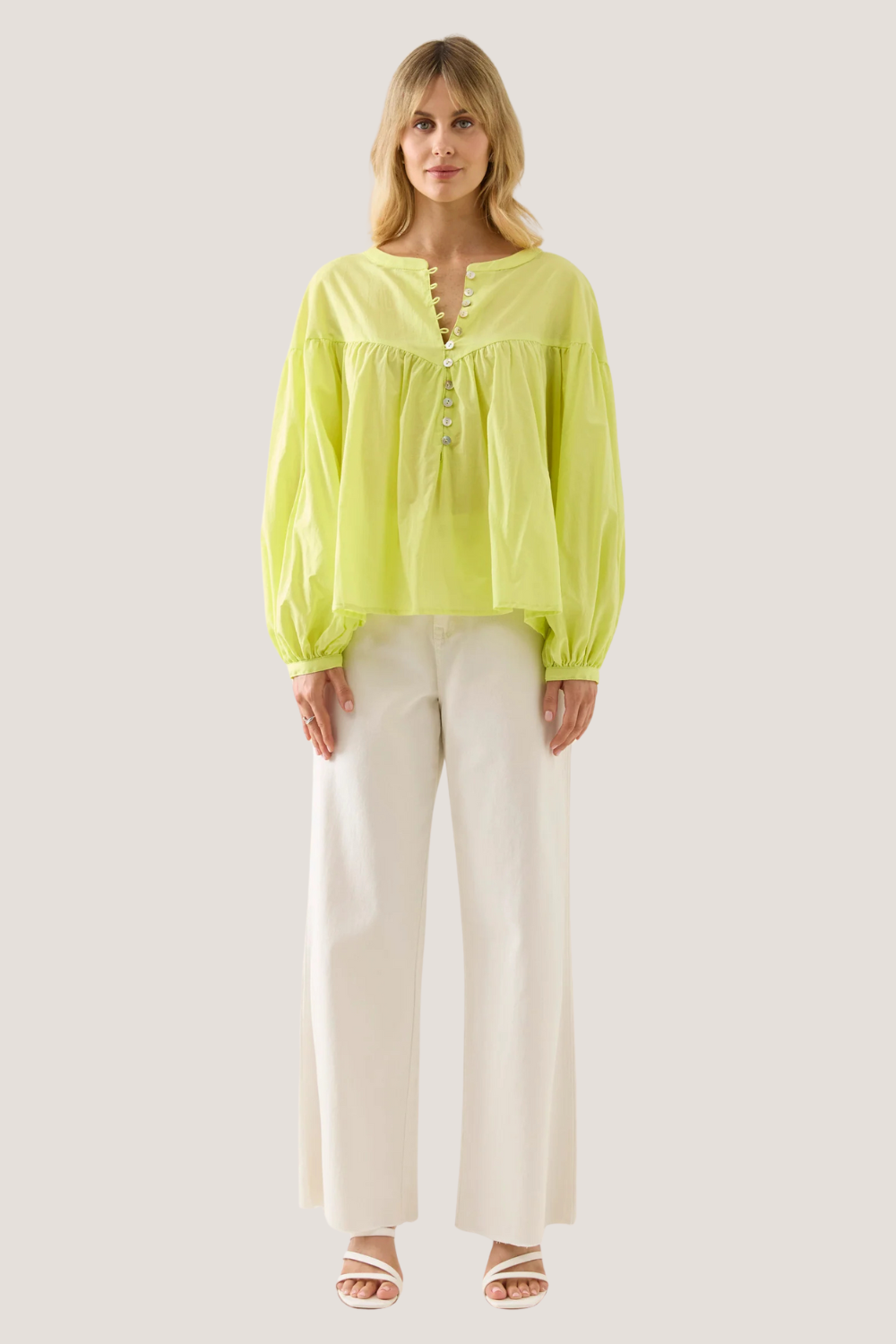 Crafted from breathable cotton voile, the Aurora Button Blouse is an airy long-sleeved piece with gathered yoke detail and delicate shell buttons. Lightweight and elegant, it provides effortless coverage from the sun.