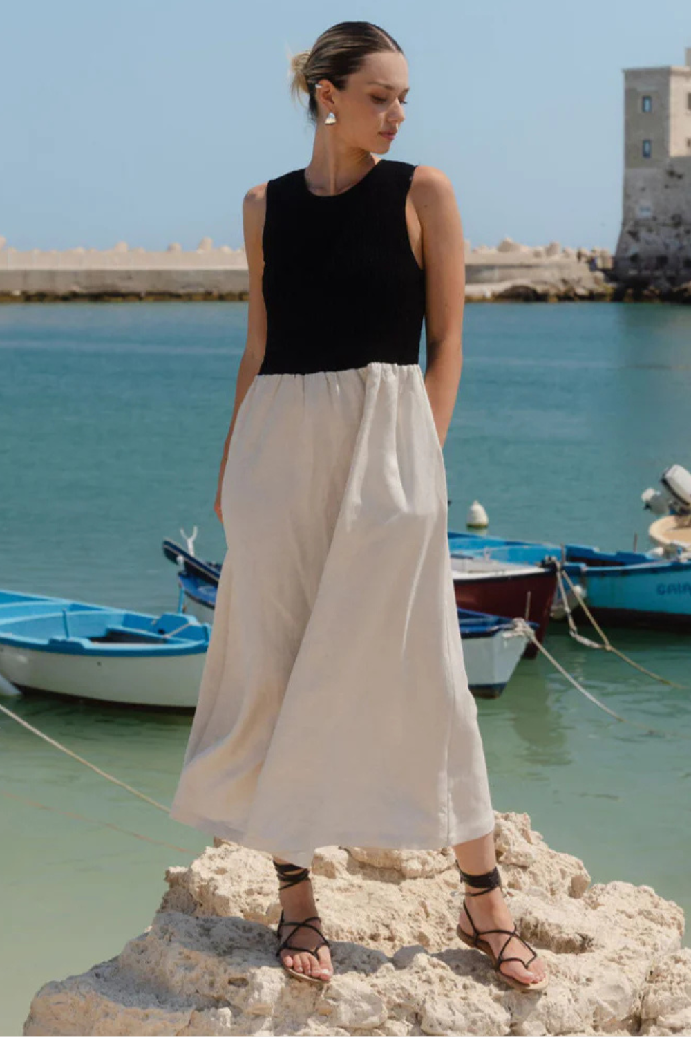 The Bryar dress is that dreamy blend of texture and shape, with a shirred black bodice that hugs just right and a full ecru skirt that flows effortlessly. Crafted from a breathable blend of linen and viscose, it offers a light, natural feel that’s perfect for any occasion casual or elevated. It’s minimal, modern, and endlessly wearable.