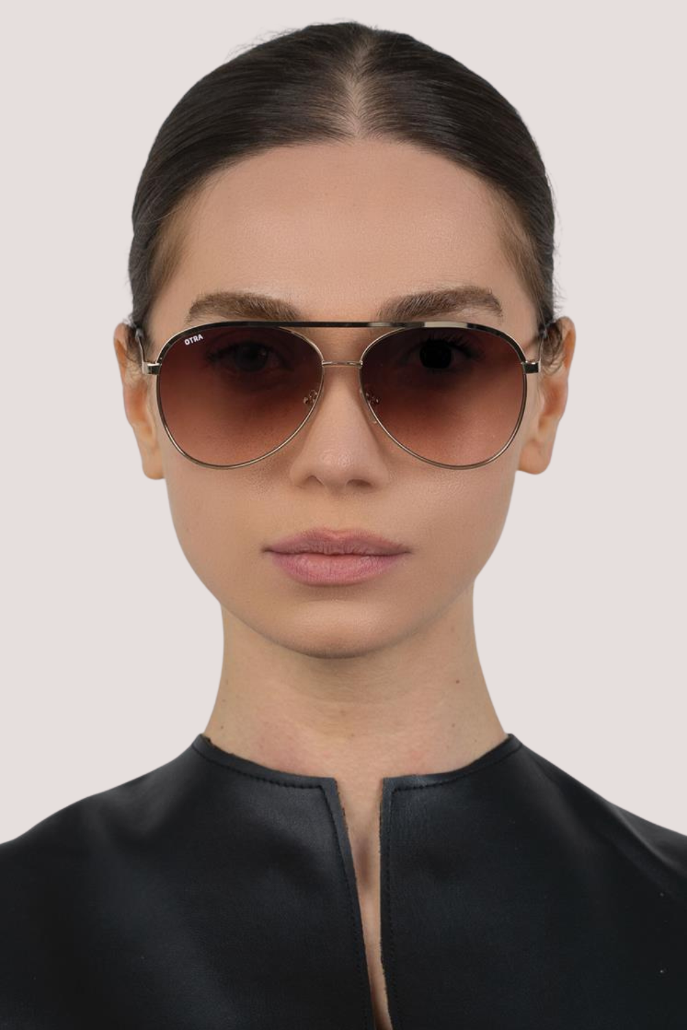 CHARLIE IS A ROUNDED METAL AVIATOR WITH GOLD FRAME AND BROWN TO PINK FADED LENS