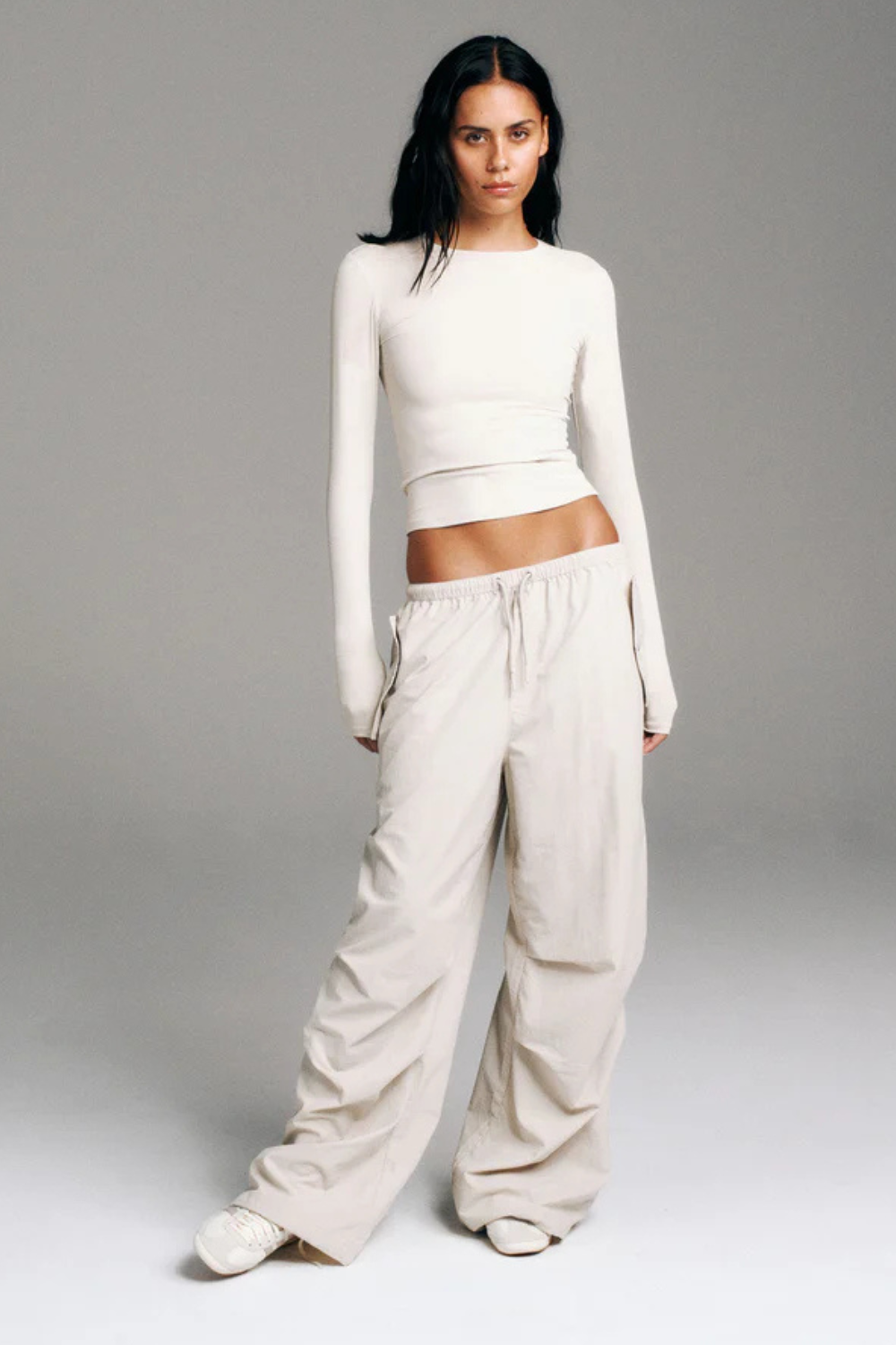 The Discovery Pant in Cloud is designed from a soft spray fabrication, this relaxed fit spray pant features a drawcord waist and hem and with side snap pockets. The Discovery Pant is the perfect every day pant, wear them with a fitted Body Luxe tee, or pair with an oversized sweat or hoodie for a cool off-duty look.