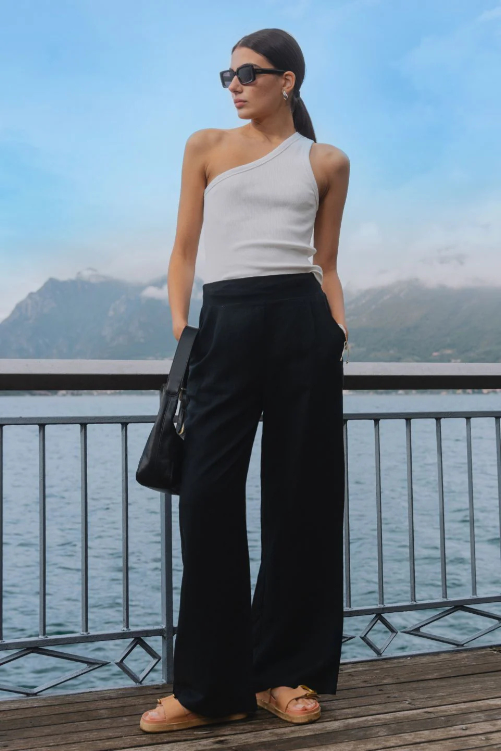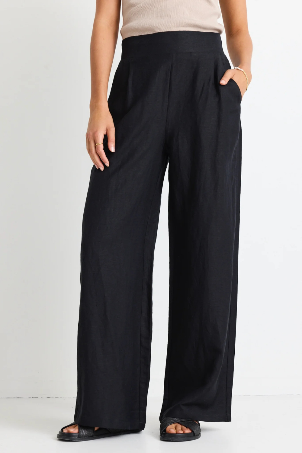Elevate your summer wardrobe with our Guardian Black Linen Pleat Front Wide Leg Pant. Made with high-quality white linen, the wide waistband and elastic back adds both comfort and style. Perfect for any occasion, these pants will keep you looking and feeling cool all summer long.