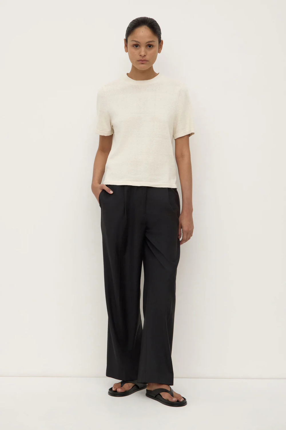 The June Silk Knit Tee in cream is a 100% silk elevated tee with a soft textured finish and ribbed neckline.