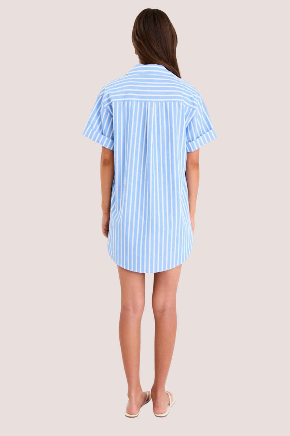 A breezy throw-on staple, the Mykonos Mini Shirt Dress delivers easy summer styling with a crisp, classic feel. The blue vertical stripe lifts the look with a fresh coastal mood, while the relaxed cut keeps things effortless for everyday wear.