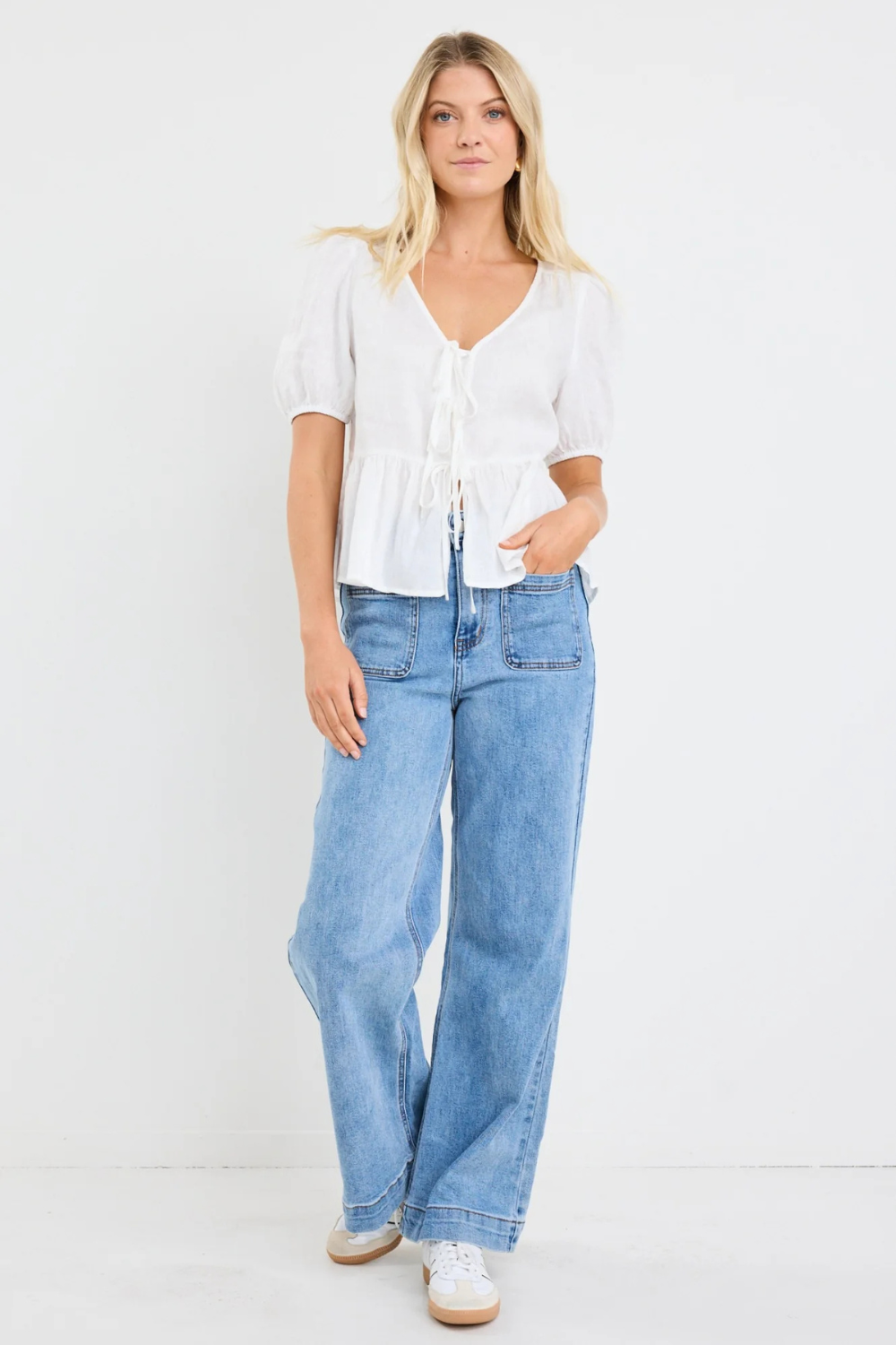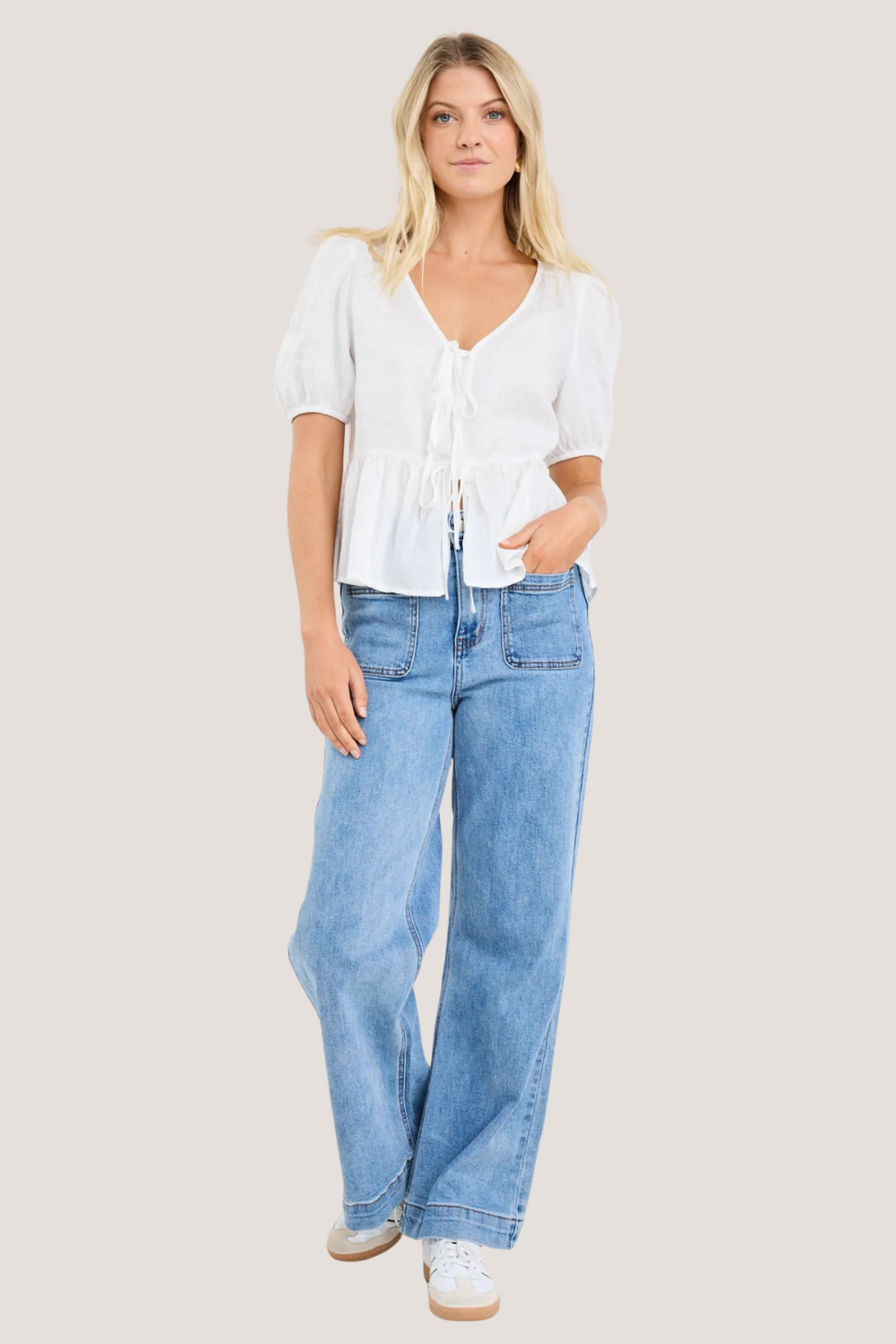 Light, breezy, and effortlessly feminine the Restore white top is a timeless essential with a fresh twist. Made from 100% linen, this natural fibre blouse keeps you cool and comfortable while offering a soft, lightly textured feel. The gathered waist and tie-front detail add shape and charm, making it a go-to piece for casual days or dressed-up moments.