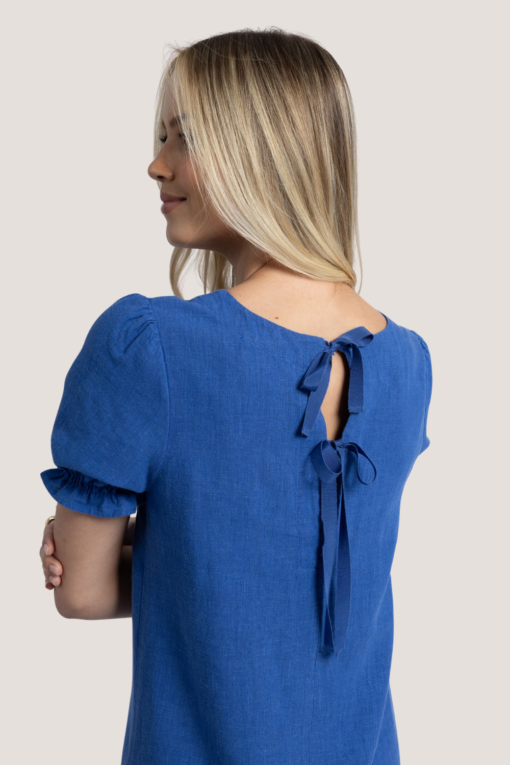 A simple go-to dress perfect for everyday - work or play. Crafted from a breathable linen blend, featuring ramie cotton and tencel (an eco-friendly yarn), this style is perfect for summer days. The real feature of this piece is the sweet, slightly puffed sleeves - secured with super soft fine elastic making them very comfortable and easy fitting to all arm sizes. The slight shoulder gathers and the ribbon tie at the back neck offer the perfect finishing touches. Pair with the Coco Slide for an everyday look.