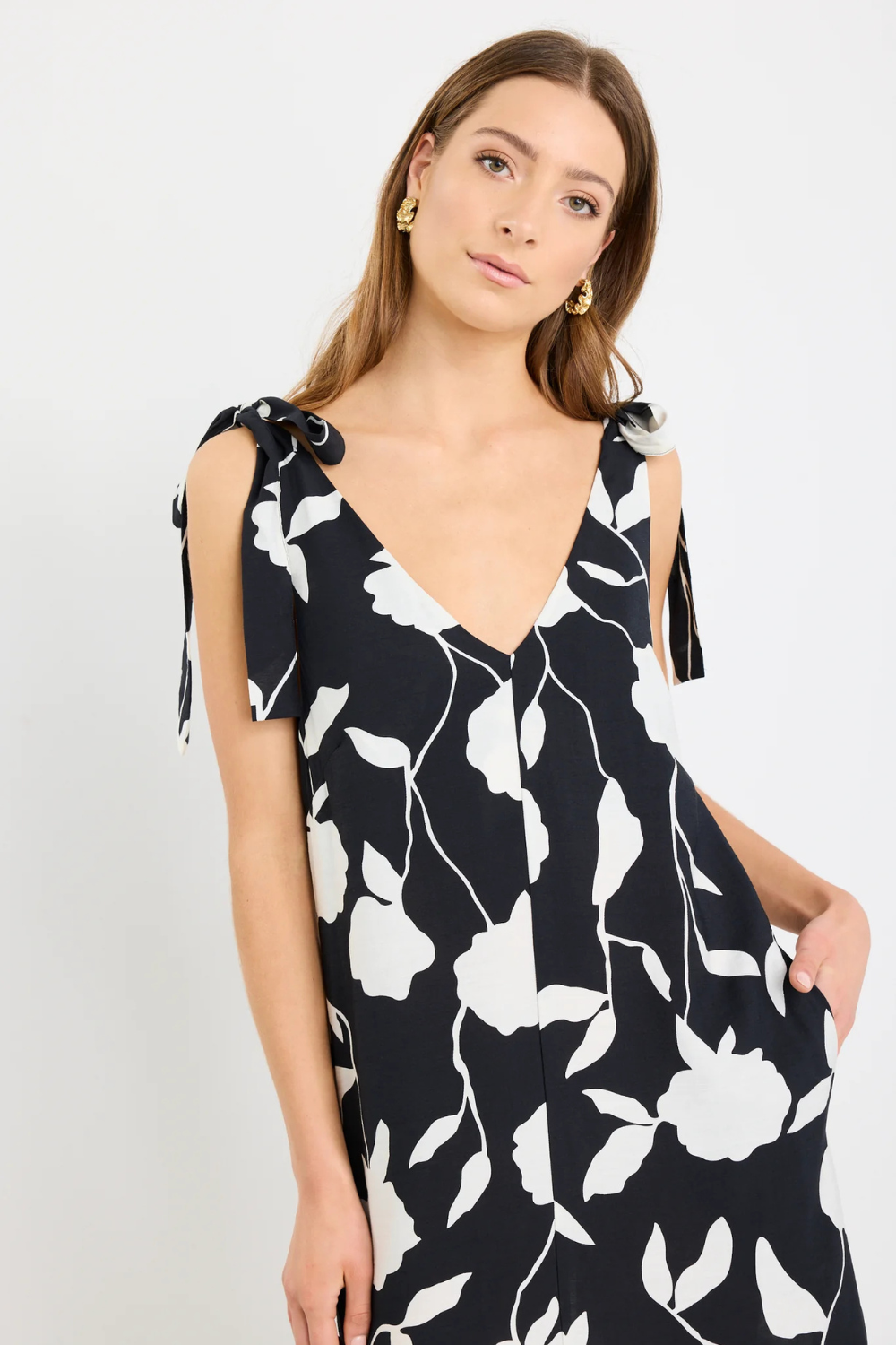 Spontaneous Black and White Floral Tie Shoulder Relaxed Midi Dress