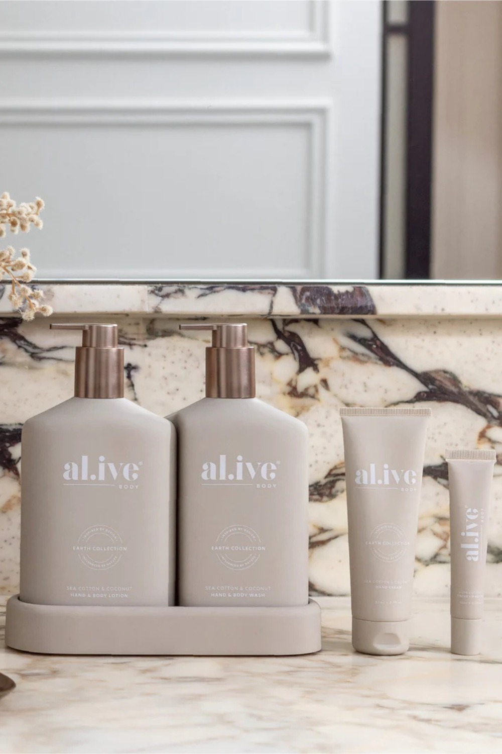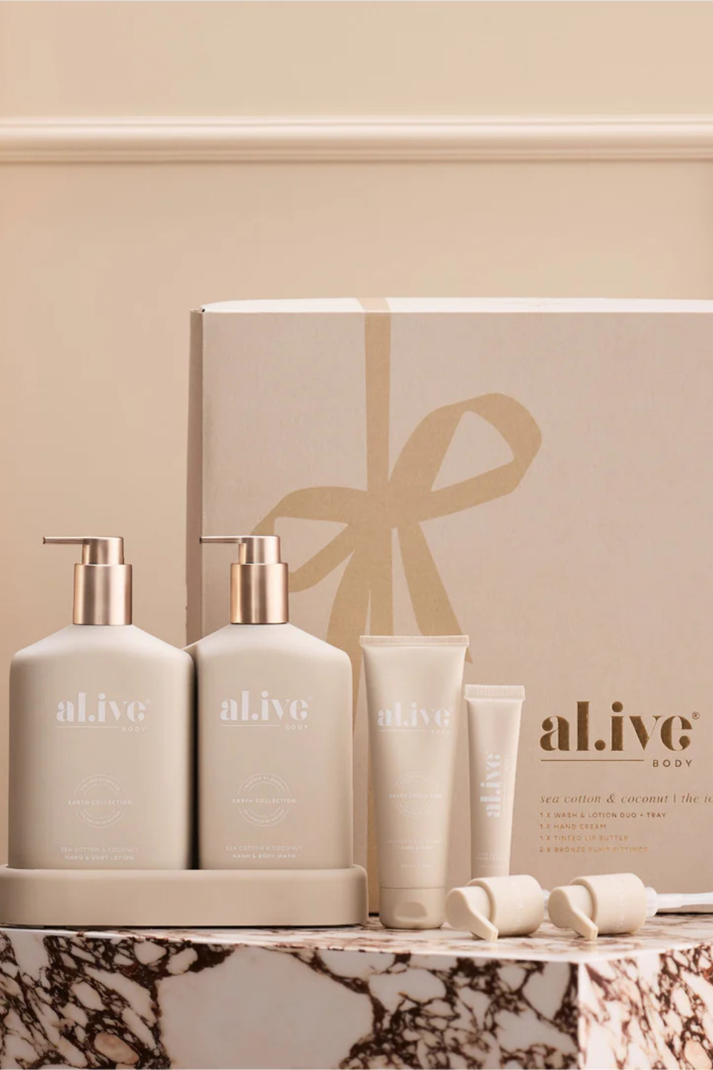 Our bestselling Sea Cotton & Coconut scent in exclusive Limited Edition packaging - four luxurious essentials including our signature interlocking bottles, Hand Cream, and Lip Butter. Clean, comforting, and beautifully presented with elegant ribbon detailing, ready to gift.